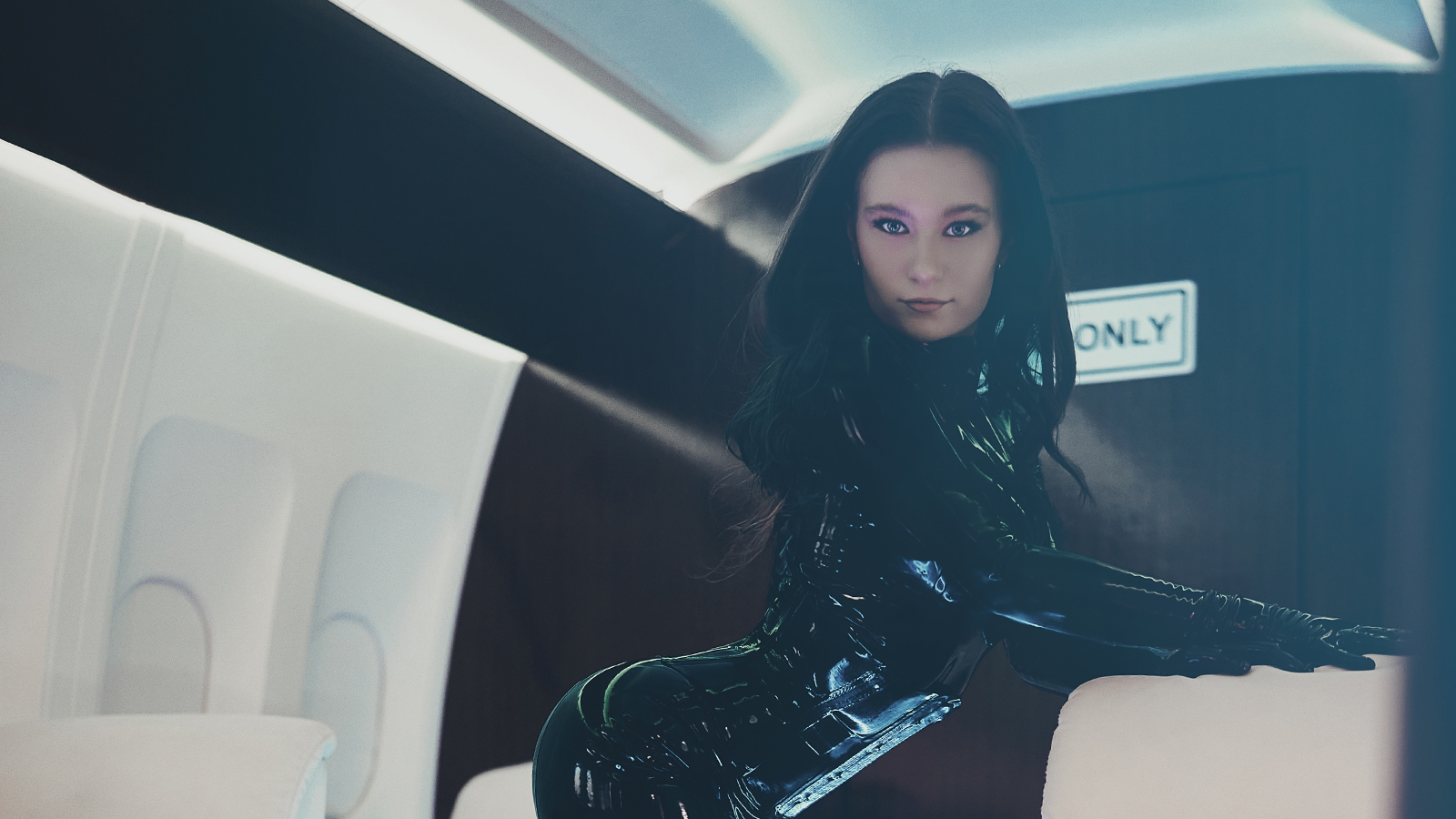 Das Setup wurde mit dem vorhandenen Umgebungslicht der Location fotografiert und um minimale kontrollierte Beleuchtung ergänzt. Das Jet-Interieur erzeugte bereits seine eigene Farbpalette: warmes Elfenbein des Leders, kühles Blau-Weiß der LED-Streifen und das tiefe Dunkel des Paneels der Tür. Das Latex nahm all das gleichzeitig auf und wechselte je nach Winkel zwischen Tiefenschwarz und Burgunder-Bronze. Kein Outfitwechsel zwischen den Setups; der einzelne Look war darauf ausgelegt, die gesamte Session durch seine eigene Kohärenz zu tragen.