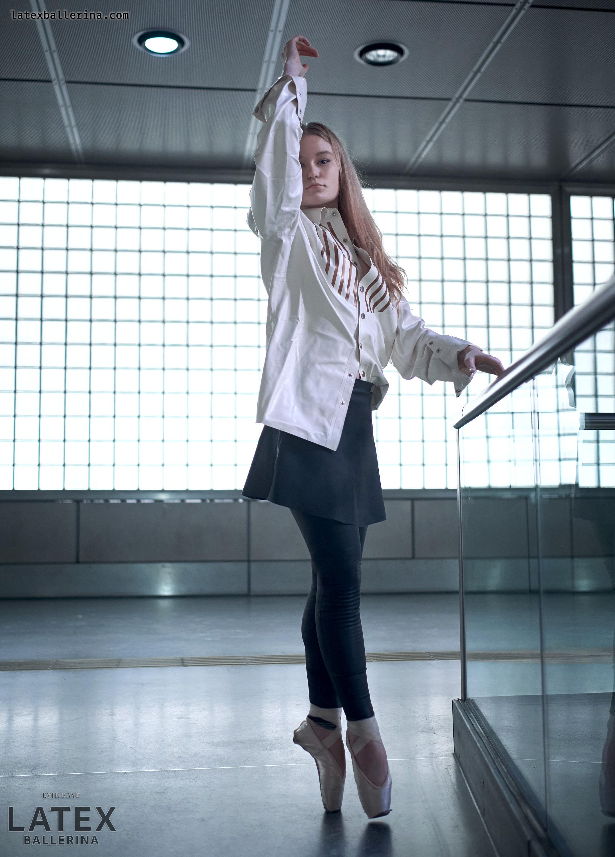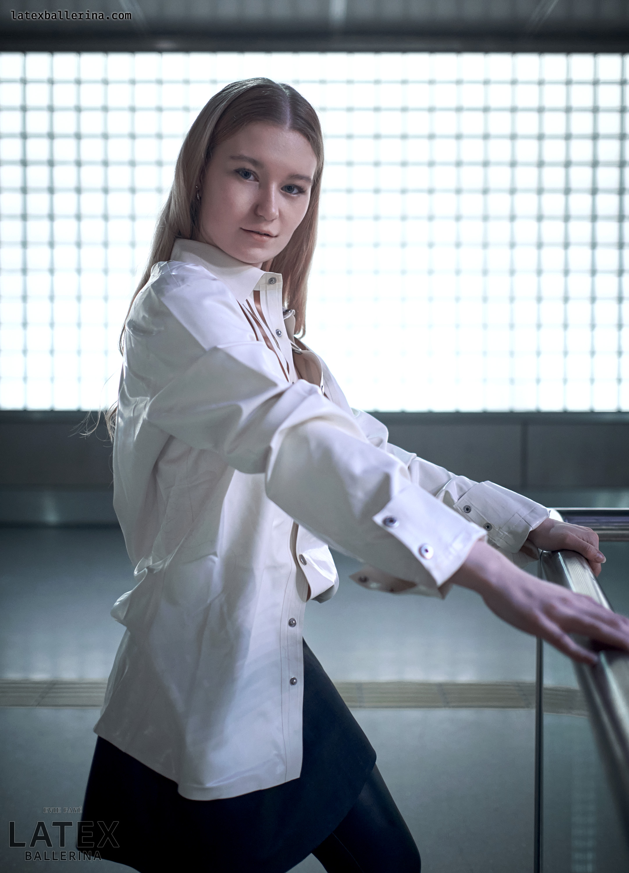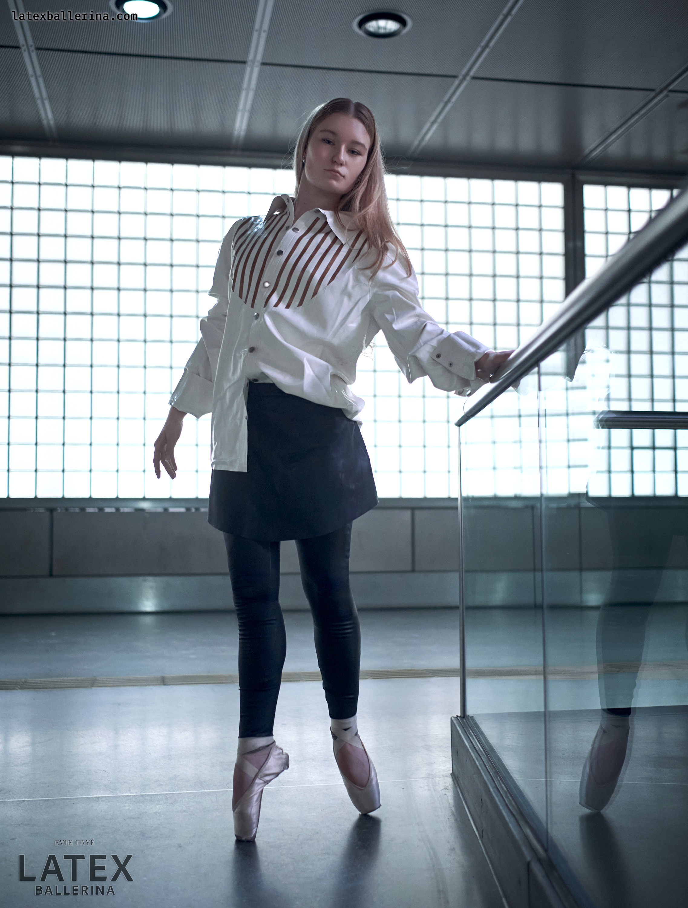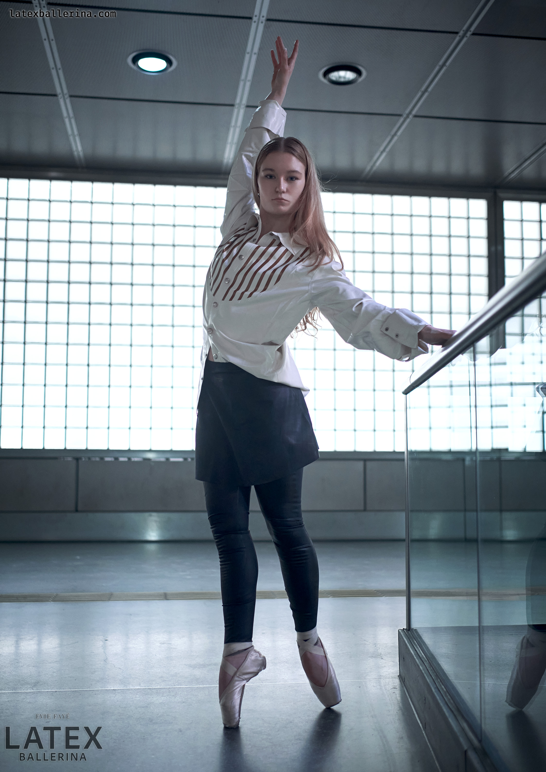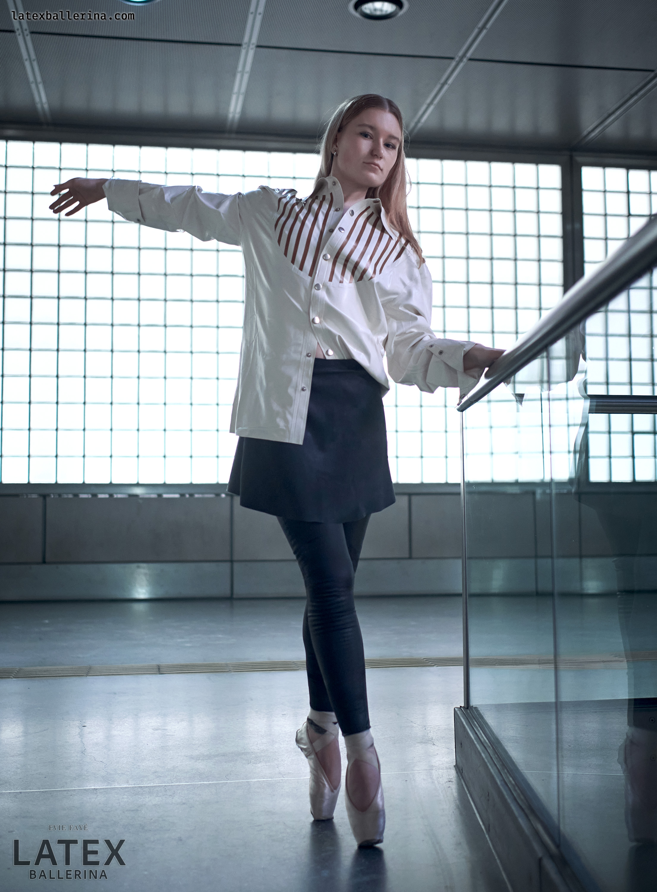 In diesen Aufnahmen wollte ich die kühle Geometrie der Station mit einem Hauch von Bewegung und Glanz entfachen. Die tiefschwarzen Latex-Leggings von latexkind schmiegen sich an jede Linie meiner Beine, wenn ich mich auf die Spitze stelle, und ihr spiegelnder Glanz spiegelt die Glaswände um mich herum. Darüber weht ein weißes Herrenhemd – die Ärmel lässig aufgekrempelt – wie ein sanfter Windhauch auf kaltem Stahl, der die harten Konturen abmildert. Darunter blitzt ein kurzer Skaterrock hervor, dessen verspielte Weite im starken Kontrast zur präzisen Haltung meiner Balletteinlage steht.