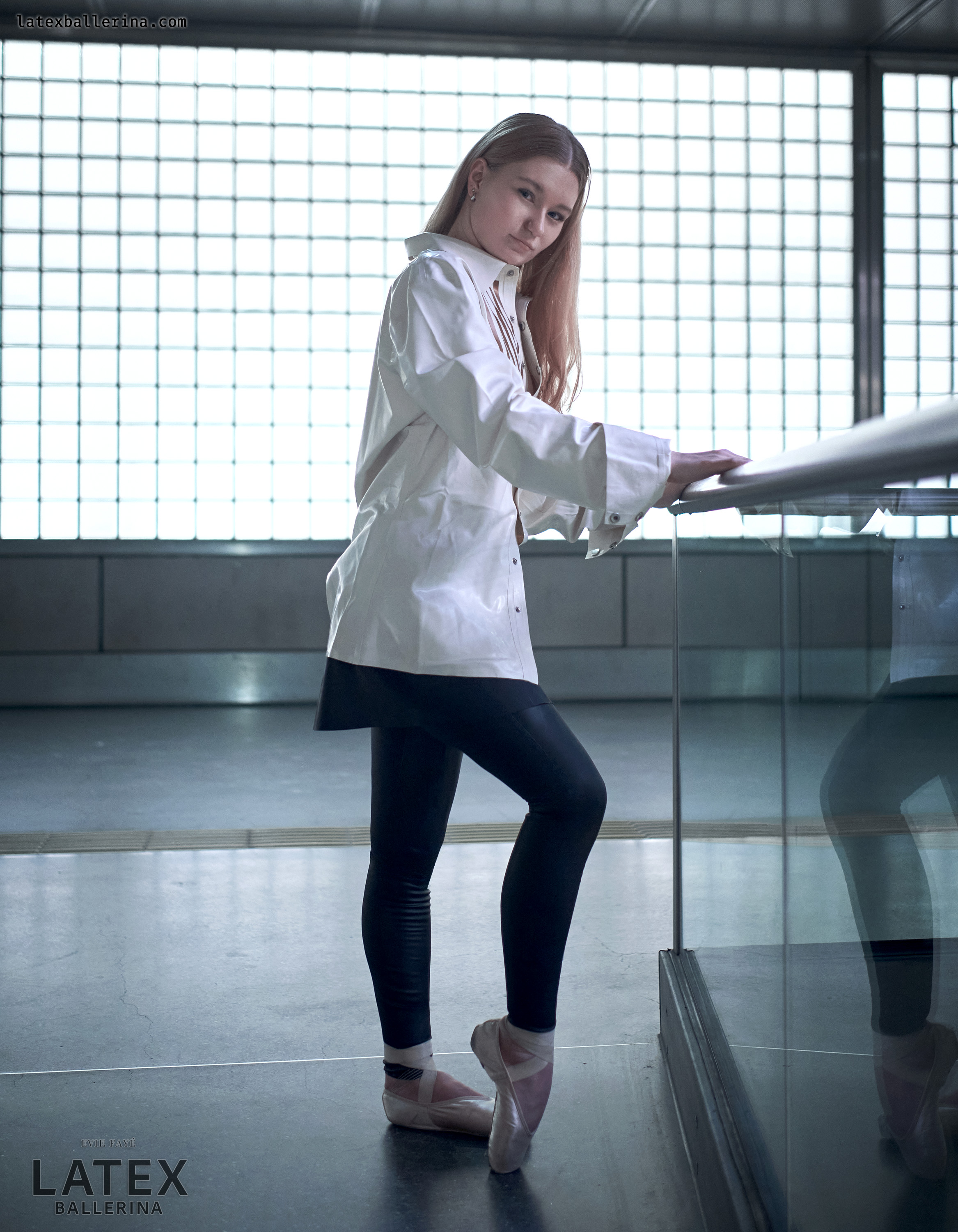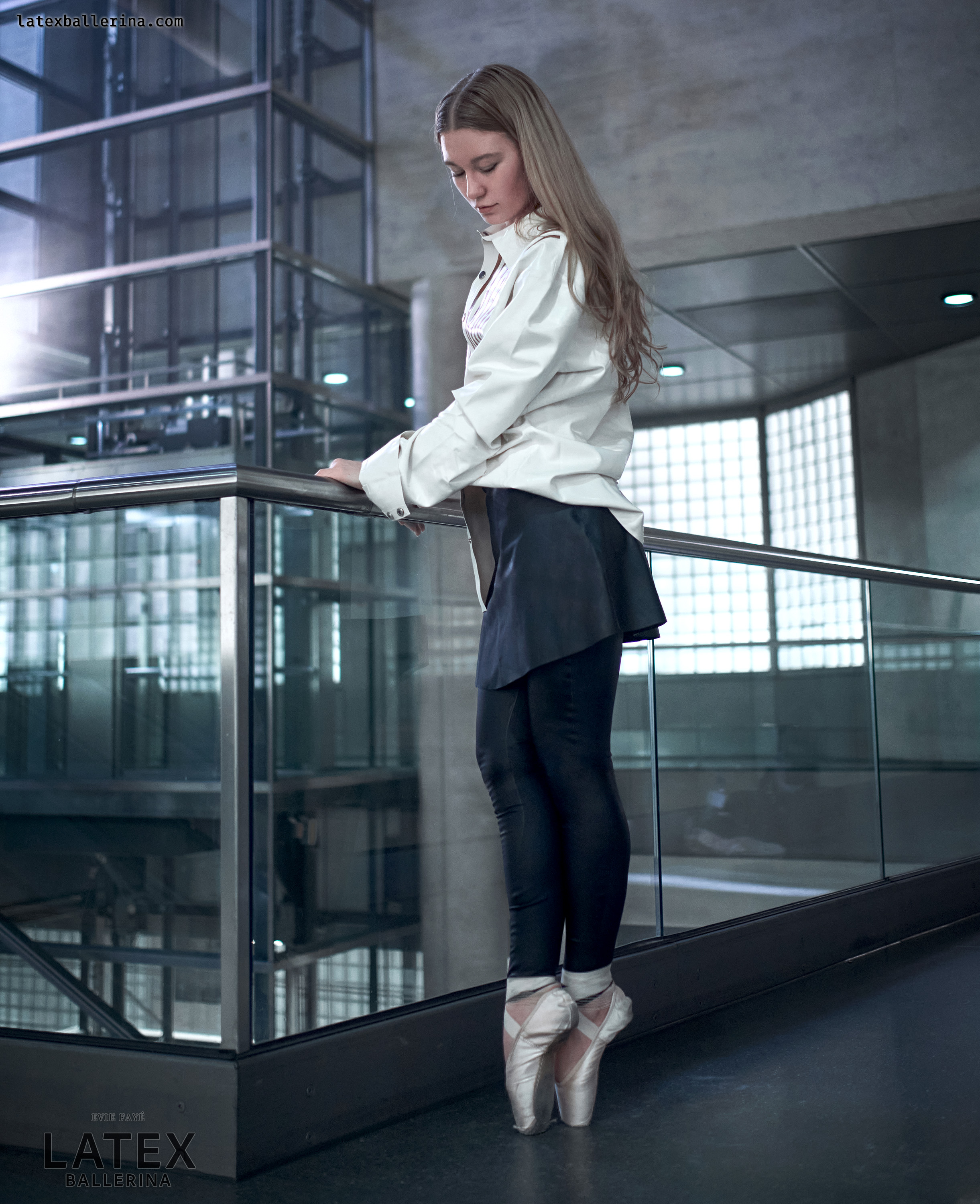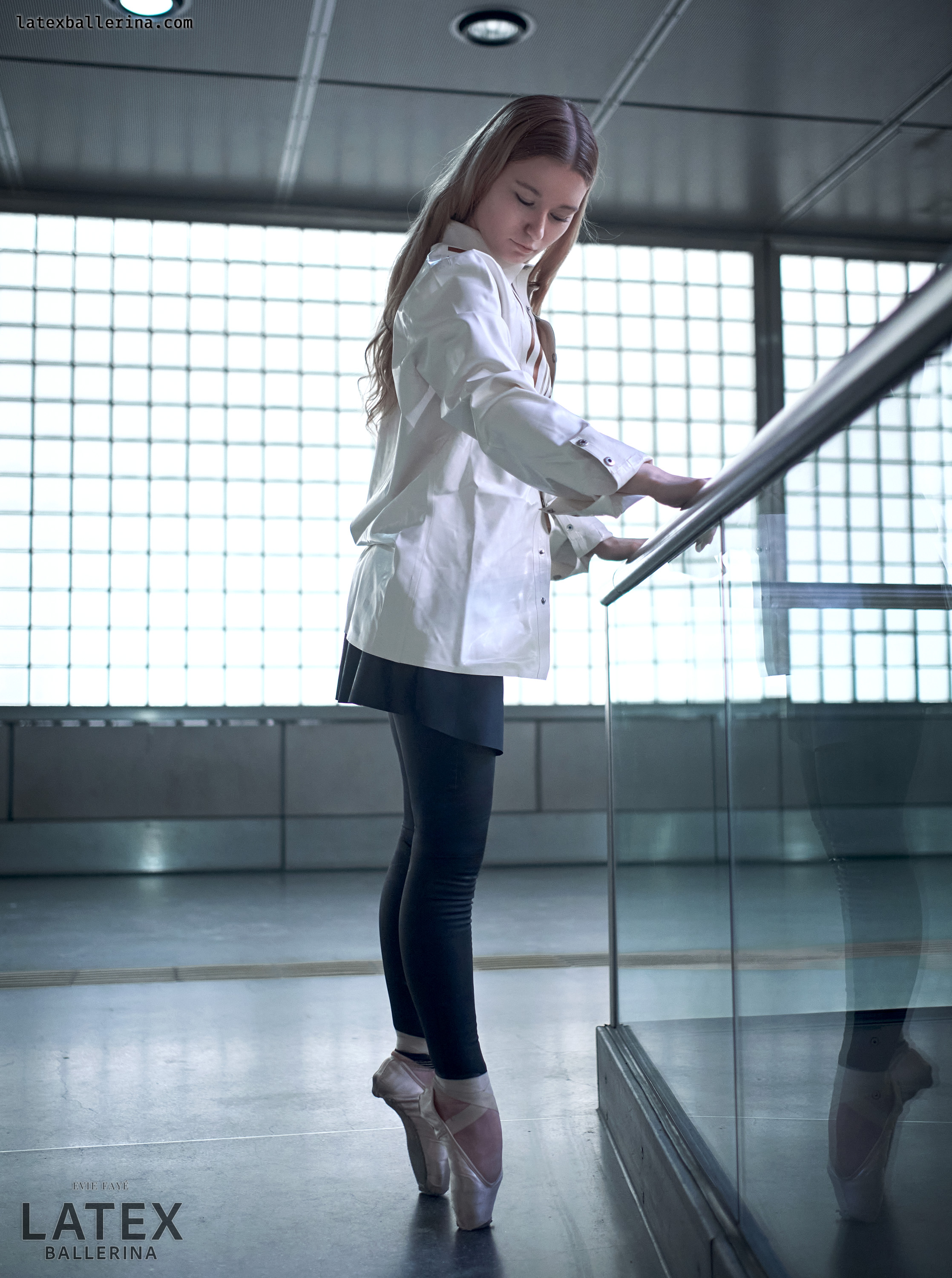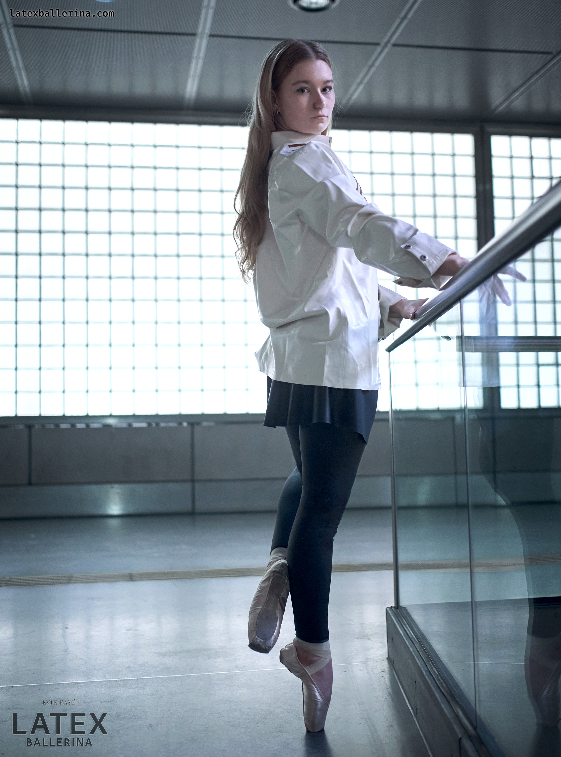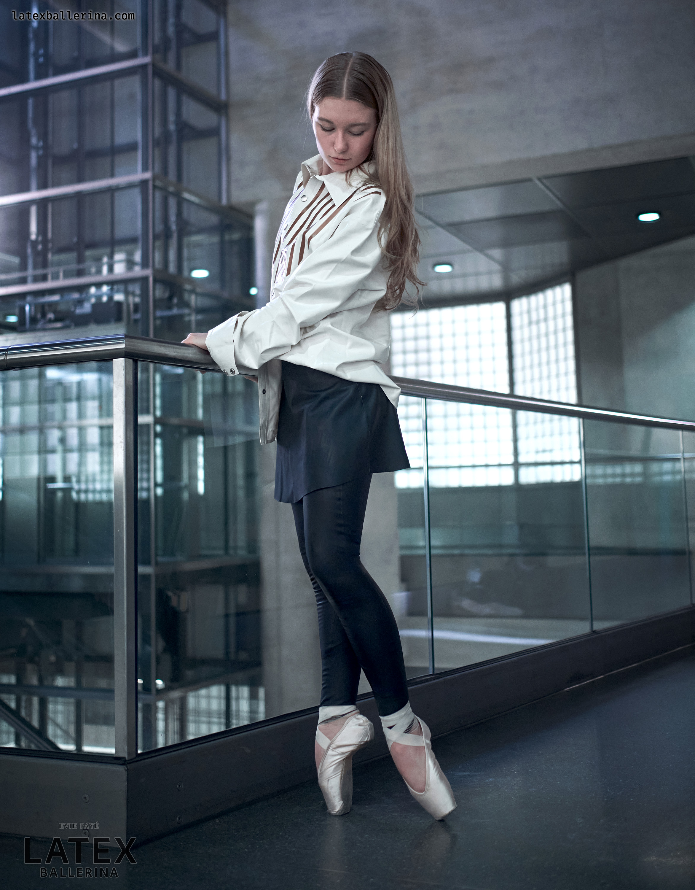 In diesen Aufnahmen wollte ich die kühle Geometrie der Station mit einem Hauch von Bewegung und Glanz entfachen. Die tiefschwarzen Latex-Leggings von latexkind schmiegen sich an jede Linie meiner Beine, wenn ich mich auf die Spitze stelle, und ihr spiegelnder Glanz spiegelt die Glaswände um mich herum. Darüber weht ein weißes Herrenhemd – die Ärmel lässig aufgekrempelt – wie ein sanfter Windhauch auf kaltem Stahl, der die harten Konturen abmildert. Darunter blitzt ein kurzer Skaterrock hervor, dessen verspielte Weite im starken Kontrast zur präzisen Haltung meiner Balletteinlage steht.