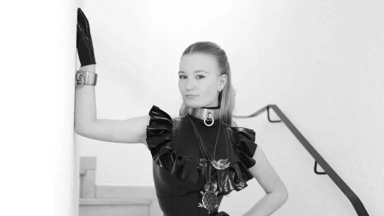Le vent vient de l’Elbe avant même qu’on aperçoive l’eau. En dessous, un catsuit en latex noir; le hoodie jaune de Raymond par-dessus, des gants en latex et des Ballet Heels sur les pavés.